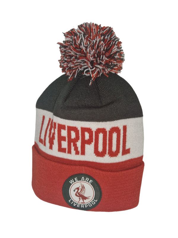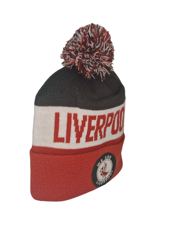 Liverpool Beanie, features: Stretch knit , red white and grey beanie, with woven We Are Liverpool Crest & red,white and grey pom pom.