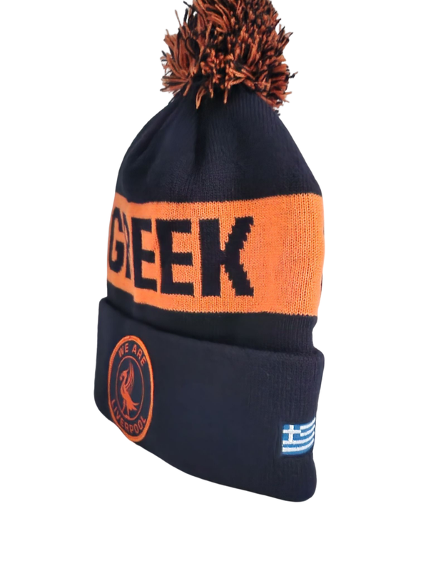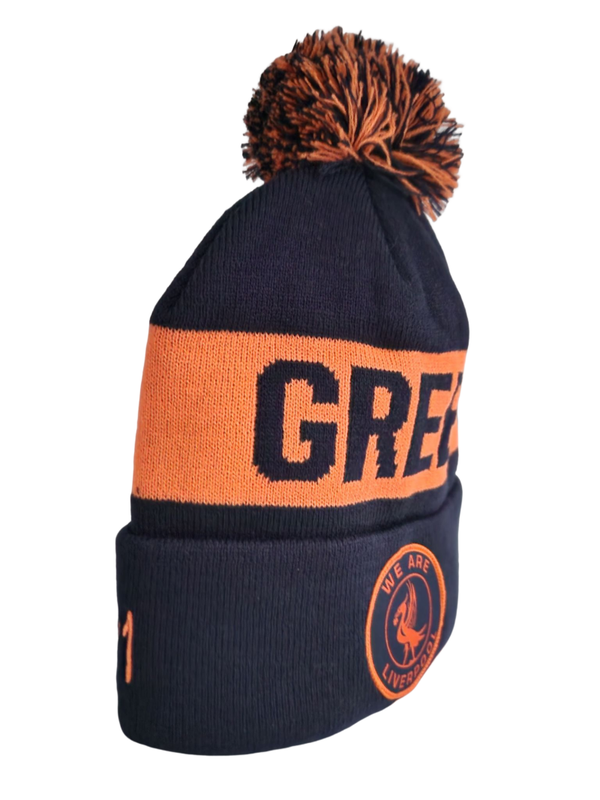 Greek Scouser Beanie Hat, features: Stretch knit , navy & orange beanie, with woven We Are Liverpool Crest, Greek Flag & embroidered player number, navy and orange pom pom & player name.